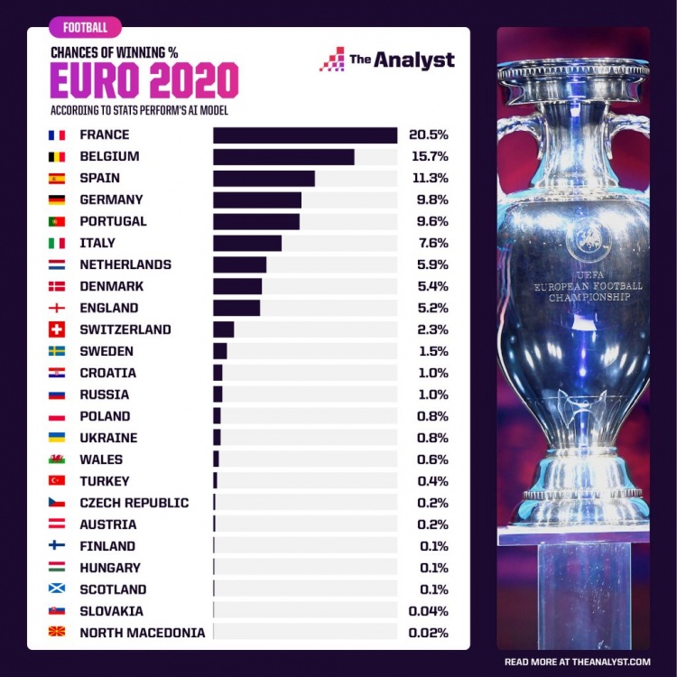 数据网站The Analyst利用AI对本届欧洲杯各队的夺冠概率进行了预测,预测结果显示法国队夺冠概率最高,比利时与西班牙位居二三,接下来则是德国、葡萄牙与荷兰,而英格兰仅居第九,排在丹麦之后。可以看到F小组有三支球队(法、德、葡)的夺冠概率都位于前五,是名副其实的死亡小组。